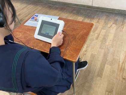 3年生は、英語の4技能(Listening・Reading・Writing・Speaking)を図る大阪市英語力調査「GTEC(Global Test of English Communication)」を実施しました。読む・書く・聞くは通常の授業やテストでも行っていますが、「話す」のテストも行います。専用のタブレットにマイクのついたヘッドセットを接続して話をして録音をします。それを採点します。ものすごく静かな状況でのテストです。生徒は一生懸命、英語を話しています。