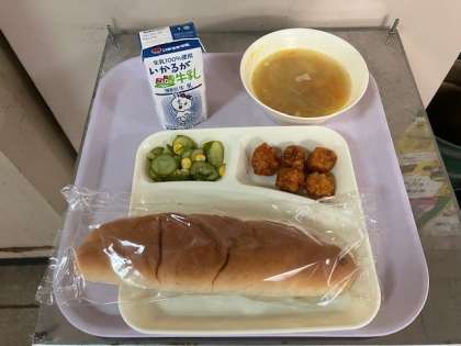 今日の給食は、レーズンパン、牛乳、まぐろのオーロラ煮、スープ、きゅうりとコーンのサラダ、です。