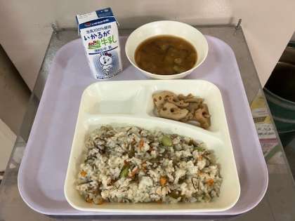 今日の給食は、ごはん、牛乳、もずくと豚ひき肉のジューシー、さつまいものみそ汁、焼きれんこん、です。