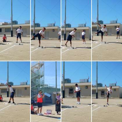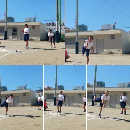 ハンドボール投げが行われています。30mオーバーが続出しています。とても良いフォームで投げています。さてどのクラスが一位になるか楽しみです。