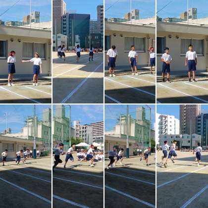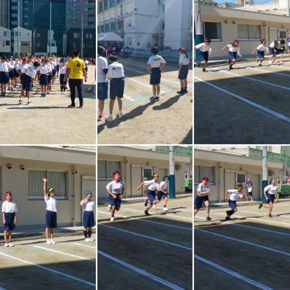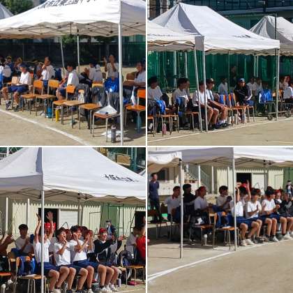 50m走が行われています。出場選手が多い種目です。クラウチングスタートから競い合います。白熱しています。写真は1年生の様子です。応援にも力が入ります。
