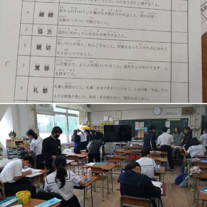 2年生の美術の授業の様子です。「名前旗作り」を行っています。とても良い作品ができています。先生からのアドバイスもあり素晴らしい作品を作ることができました。後片付けもしっかりできました。