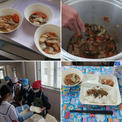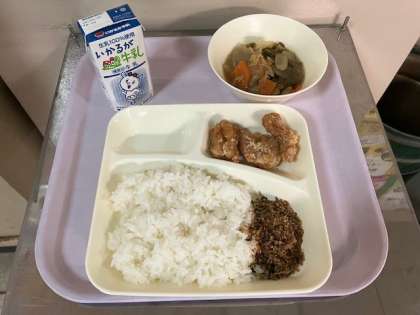 今日の給食は、ごはん、牛乳、鶏肉のたつたあげ、あつあげと野菜の煮もの、おかかなっ葉、です。