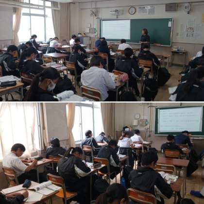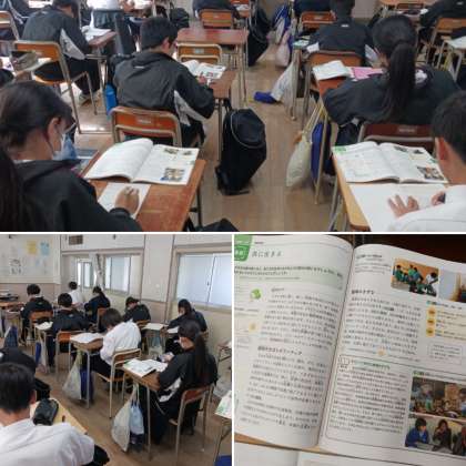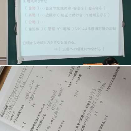 2年生の保健の授業では防災について学習しています。災害がおこった時の対応や地域との関わりについて先生から説明がありました。災害が起きた時、お家の方が仕事に行っている間の時間帯は小・中学生が必要になります。何かあった時の地域との連携は大切なことですね。