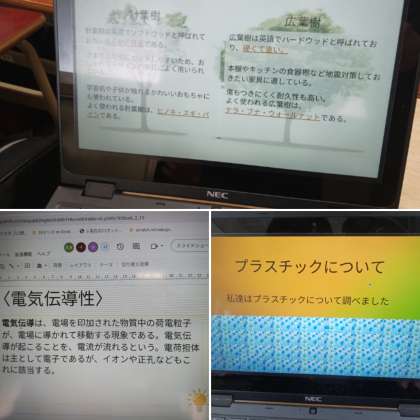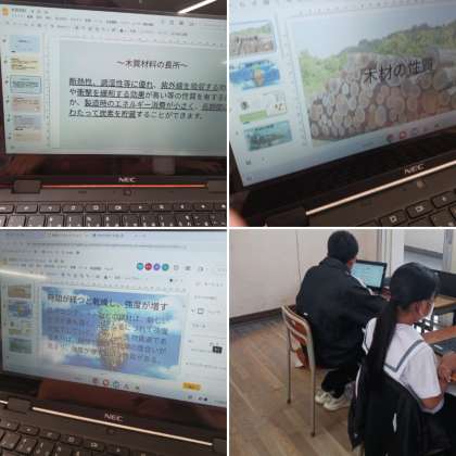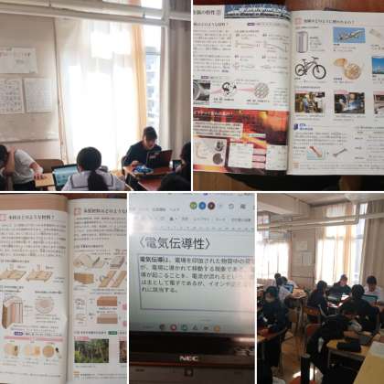 1年生の技術の授業では「材料と加工の技術」について学習しています。木材の性質や金属の性質、プラスチックの性質について班で情報収集しスライドにまとめました。以後の授業でスライドを共有して意見交換を行います。