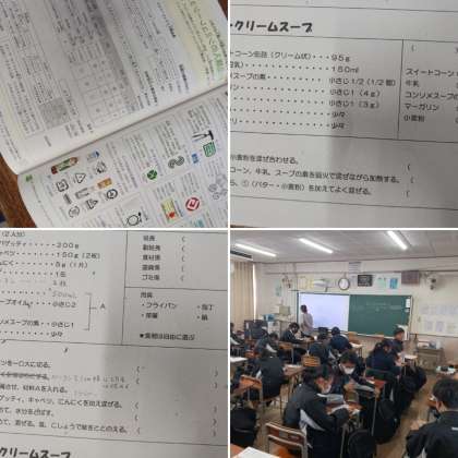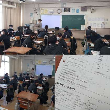2年生の家庭科の授業では調理実習の事前学習を行っています。班長の選出を話し合った後、今回の調理実習のポイントについて先生から説明がありました。先生がパワーポイントを用いて細かな内容を提示しています。