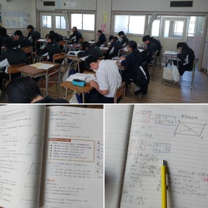 2年生の数学の授業は「証明」について学習しています。昨日学習した平行四辺形の条件等について確認しています。計算問題と違って、答えを導きだすまでに考える時間が長いかもしれませんね。練習問題を重ねて頑張って答えを導けるようにしていきましょう。