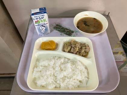 今日の給食は、ごはん、牛乳、豚肉と野菜のいためもの、いわしのつみれ汁、かぼちゃういろう、焼きのり、です。