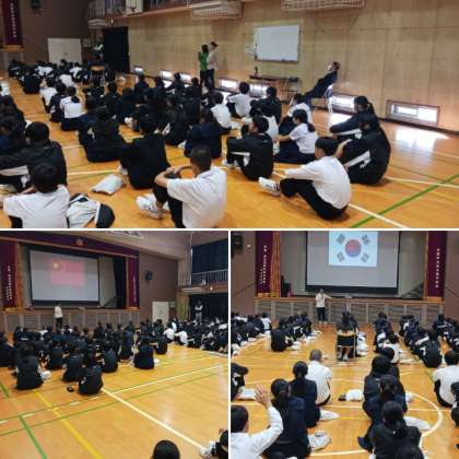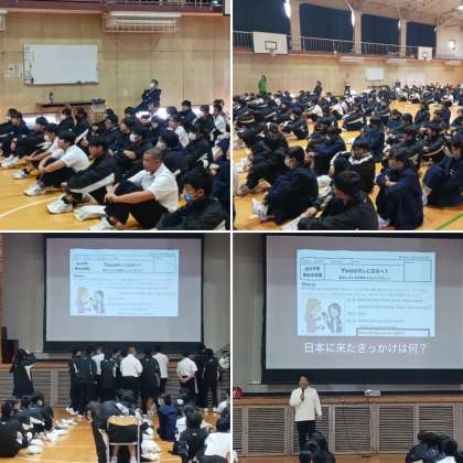 全校集会の後、そのまま体育館に1、2年生は残って、1時間目総合の授業「校外学習の取り組み」を行いました。いよいよ今週11月14日(木)に校外学習を行います。奈良での取り組みの説明がありました。最近ではたくさんの外国の方が来日しています。そこで、外国の方にインタビューをしてみようという取り組みを行います。この時間はその説明となります。