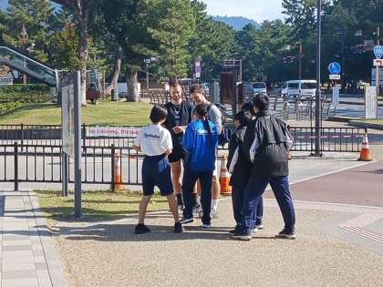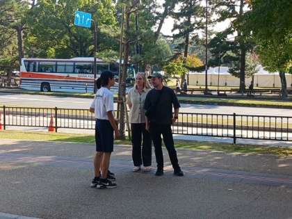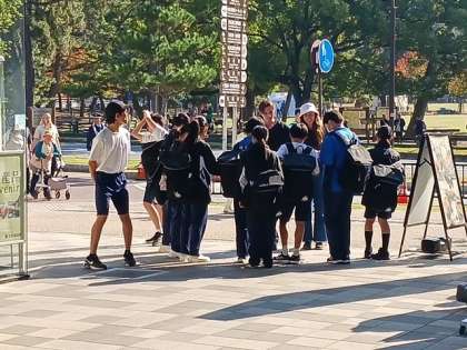 多くの班が昼食を済ませて、昼からの活動を行っています。奈良公園近くのバスターミナルでは校外学習の取り組みの1つである海外の方へのインタビューを行っていました。最初は緊張していた生徒も慣れたのか気さくにインタビューを行っていました。日本の有名な場所や美味しい食べ物を楽しむために日本に来た人が多いことが分かりましたね。昼からの取り組みも頑張りましょう。