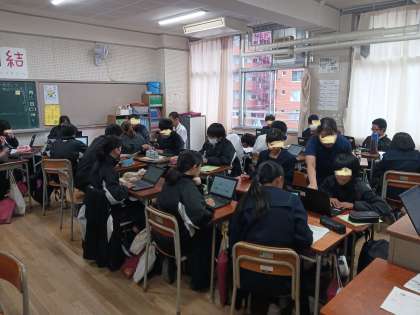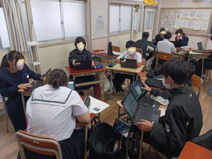 今日の6時間目、1、2年生の総合の授業では昨日11月14日(木)の「校外学習事後学習」の取り組みを行いました。奈良での訪問場所やその道中での取り組みを、班で振り返っています。役割分担を決めて、今回一緒に活動したメンバーで協力し合い、班で1枚のスライドを作成しています。