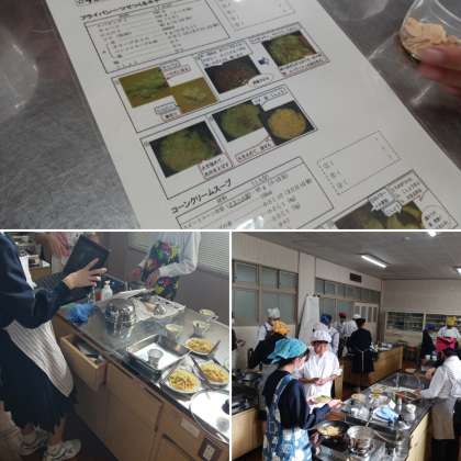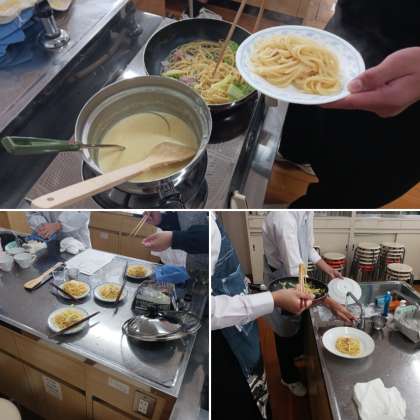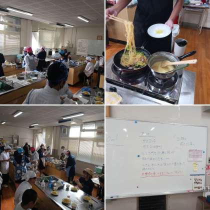 2年生の家庭科の授業は「調理実習」を行っています。今日は前回までの授業で学習した内容を踏まえ、手順に従って実習が行われました。パスタとコーンスープを調理しました。とてもおいしそうにできています。火傷や怪我もなく実習ができました。調理実習の後は、給食です。