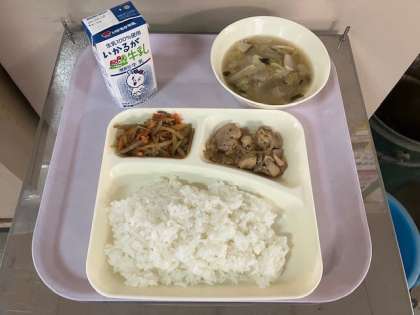今日の給食は、ごはん、牛乳、鶏肉の梅風味味焼き、うすくず汁、きんぴらごぼう、です。