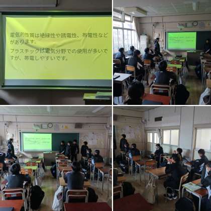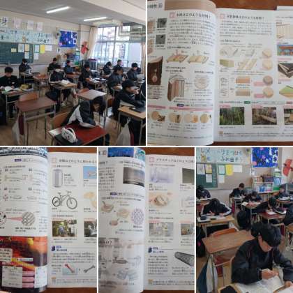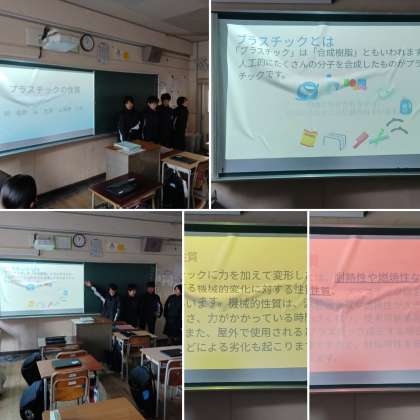 1年生の技術の授業は「材料と加工の技術」を学習しています。製図と平行して班で調べたスライドの発表を行っています。今日は最後の班発表でした。内容はプラスチックの性質でした。実習を行う上で特徴や性質を知ることはとても重要なことですね。期末テスト明けは等角図の製図法について学習します。