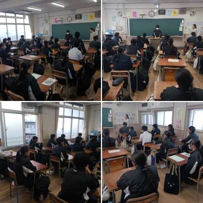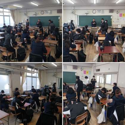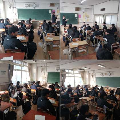 2年生の朝の学級活動(学活)の様子です。クラスごとで「1日の注意」「期末テストの素点確認」「席替えの発表」が行われています。2学期もあと少しです。風邪をひいたりして体調を崩しがちになる季節です。体調を整えて、残りの学校生活を頑張り、楽しい冬休みを迎えましょう。
