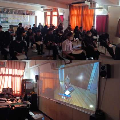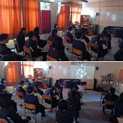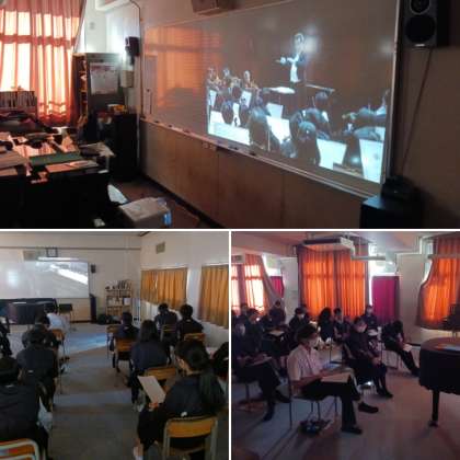 2年生の音楽の授業の様子です。今日は「鑑賞」を行っています。様々な楽器についての鑑賞を行いました。金管楽器の素敵な音が響いていました。