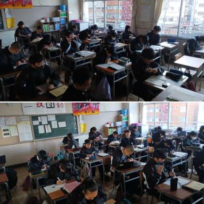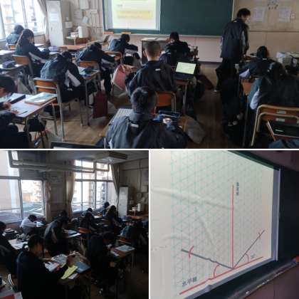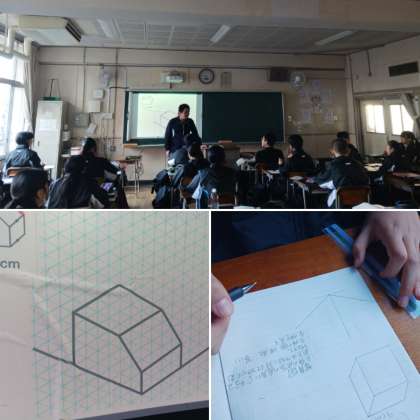 1年生の技術の授業は「製図」を行っています。今日は全体を見る製図法である等角図の学習を行いました。30°の表し方やその他の規則を把握するために今日は製図用紙を使わずに行いました。今日学習した規則に従い次回製図用紙を用いてキャビネット図を等角図にする練習問題に取り組みます。