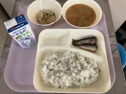 今日の給食は、菜飯、牛乳、みそ汁、いわしのしょうが煮、高野どうふの煮もの、です。