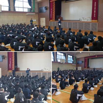 12月2日(月)の全校集会のようすです。校長先生からは努力することの重要性、生徒指導主事からは挨拶について、また懇談時の諸注意がありました。生徒会からは授業にしっかり取り組もうとのアナウンスがありました。