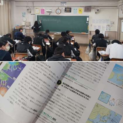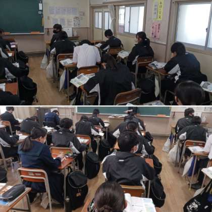 2年生の理科の授業の様子です。この日は「地学」の学習をしました。日本の四季と低気圧の関係について先生から説明がありました。覚えるのが大変そうな色んな語句が登場しました。