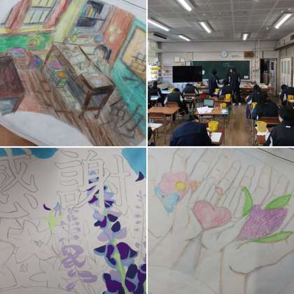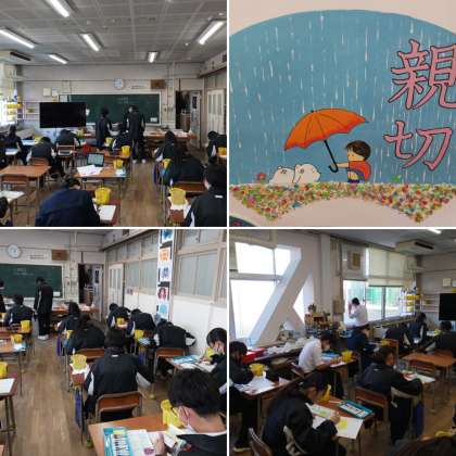 2年生の美術の授業の様子です。この日は「品格教育うちわ」作りを行いました。絵の具での作業を行っていました。個別に塗り方等の細かいアドバイスが先生からあり、さらに作業がはかどりました。素敵なうちわの完成が楽しみです。