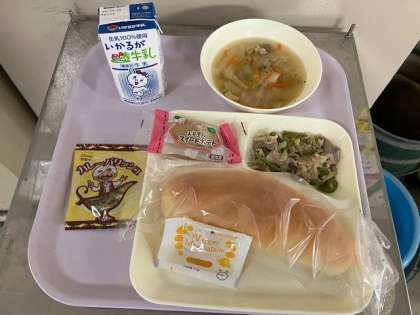 今日の給食は、コッペパン、マーマレード、牛乳、豚肉と野菜のソテー、スープ、スイートポテト、カレーフィッシュ、です。