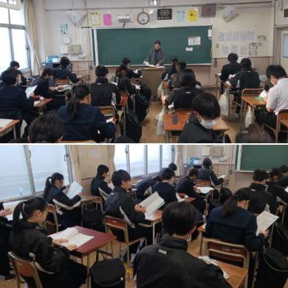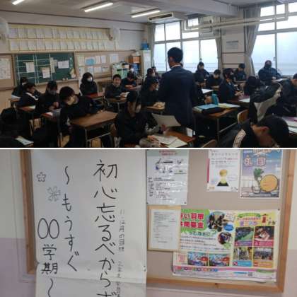 今日から3学期が始まります。2週間ぶりの登校です。始業式前の2年生の様子です。朝学活で健康観察や提出物、今日の予定の確認が行われています。始業式に臨む服装等も素晴らしかったです。