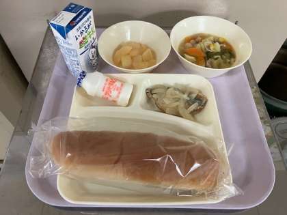 今日の給食は、黒糖パン、牛乳、あじのレモンマリネ、てぼ豆のスープ煮、白桃(カット缶)、発酵乳、です。
