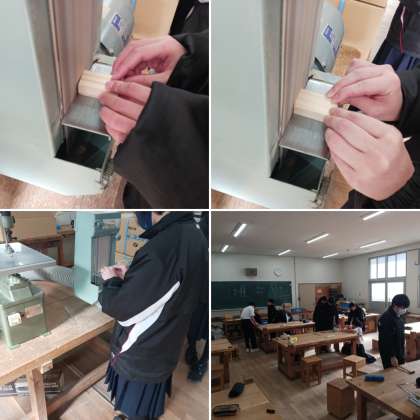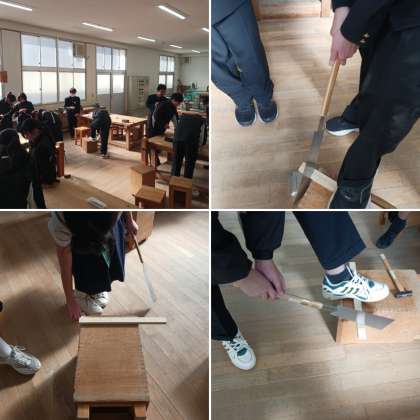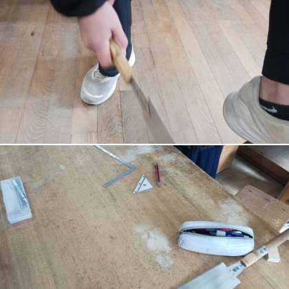 1年生の技術の授業では材料と加工の技術について学習しています。今日は実習で使う工具「さしがね」や「両刃のこぎり」を使い練習をしました。のこぎりでの切断作業ですが15°〜30°を意識する事が難しかったですが、練習を重ねることが良い作品を完成させる1つです。来週は実習の計画をそれぞれの班で行います。