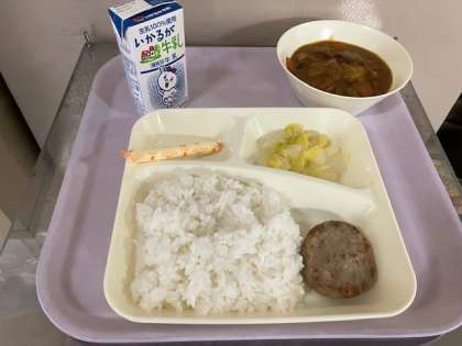 今日の給食は、豚肉と金時豆のカレーライス、牛乳、ミニハンバーグ、はくさいのピクルス、棒チーズ、です。