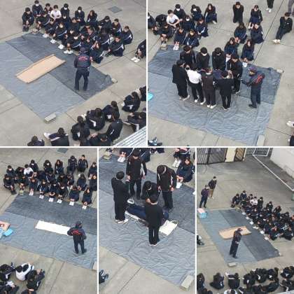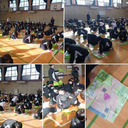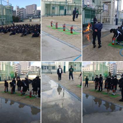 火災を想定した避難訓練の後、各学年での取り組みを淀川消防署の方からのご指導をいただきながら行いました。1年生はグラウンドで水消火器を使用した初期消火訓練。2年生は体育館で救命訓練(胸部圧迫練習)。3年生は中庭で毛布を活用した担架作成訓練。地域の中で中学生が大きな役割を担うことを想定した取り組みでした。
