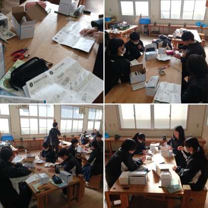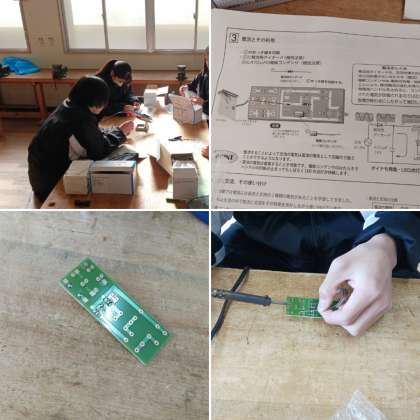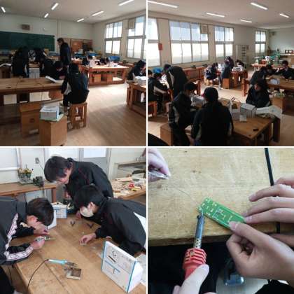 2年生の今日の技術の授業は「エネルギー変換の技術」について学習しています。2学期から先週までに学習した知識を踏まえて今日から実習です。担当の先生から電気回路、電子部品の働き、極性等の説明があった後抵抗器のはんだ付けを行いました。来週はコンデンサやダイオード等のはんだ付けを行い、回路を作ります。