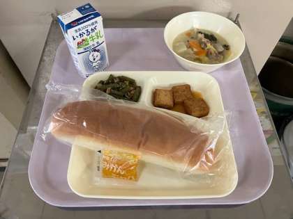 今日の給食は、コッペパン、みかんジャム、牛乳、はくさいのクリーム煮、あつあげのピリ辛じょうゆかけ、豚肉とさんどまめのオイスターソースいため、です。
