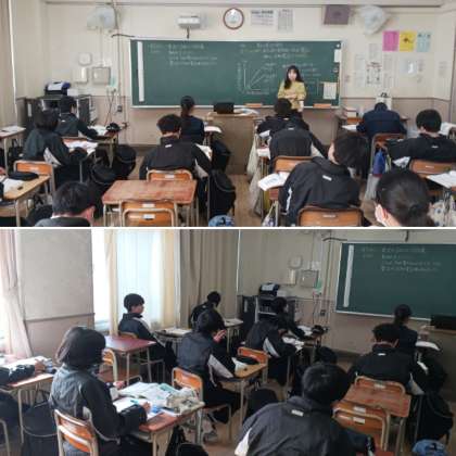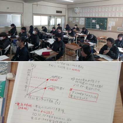 2年生の理科の授業の様子です。「電圧と電流の関係」について学習しています。今日はオームの法則について先生から説明がありました。様々な公式がでてきています。しっかり覚えましょう。