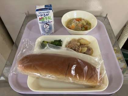 今日の給食は、黒糖パン、牛乳、鶏肉とじゃがいものガーリック煮、スープ煮、ブロッコリーのサラダ、です。