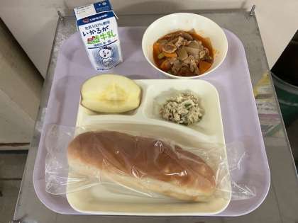 今日の給食は、おさつパン、牛乳、ケチャップ煮、ささみと野菜のソテー、りんご、です。