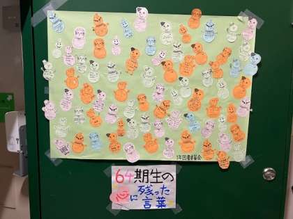 1年生のフロアに、図書委員会が制作した「64期生の心に残った言葉」が掲示されています。64期生1年生の生徒が読んだ本から、自分たちの心に残った言葉を、雪だるまのイラストの中に書いています。読んでいると、今の1年生の雰囲気が伝わってきます。