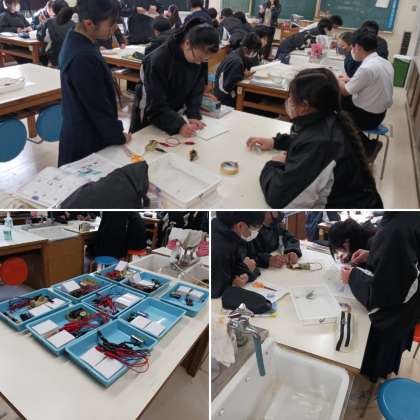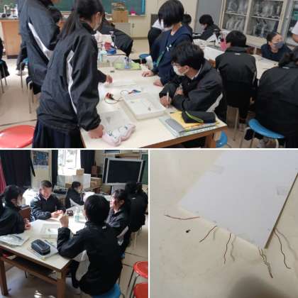 2年生の理科の授業では「回路に流れる電流」について学習しています。導通の有無を調べその結果からかくされた導線の繋がり方を推測上との授業目標の下実験が行われています。自分たちが班で考えた回路の導通の有無を確認しています。