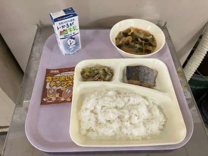 今日の給食は、ごはん、牛乳、みそ汁、さごしのしょうゆ煮、キャベツの赤じそあえ、おさつチップス、です。