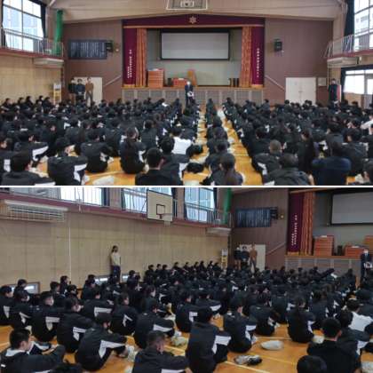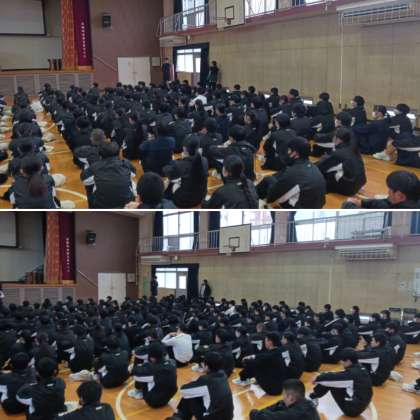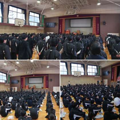 今日は週初めの全校集会の日です。校長先生や生徒指導主事から先週の小中交流会の様子なども話がありました。いよいよ3年生は私学入試が直前となりました。今週は特に寒くなるとのことです。3年生のみなさん、体調管理を整えて本番にのぞんでください。