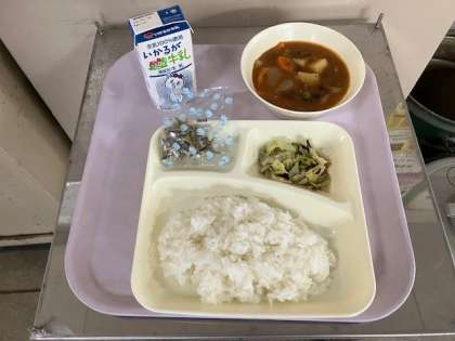 今日の給食は、ハヤシライス、牛乳、キャベツのひじきドレッシング、ミニフィッシュ、です。