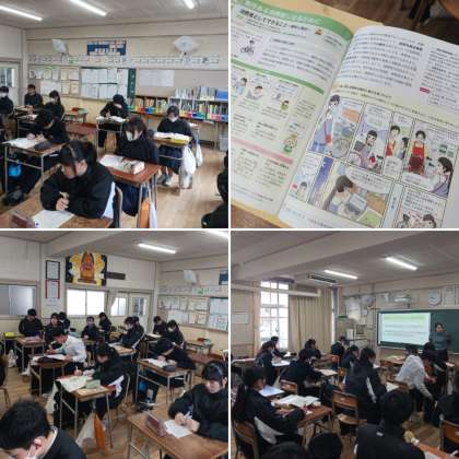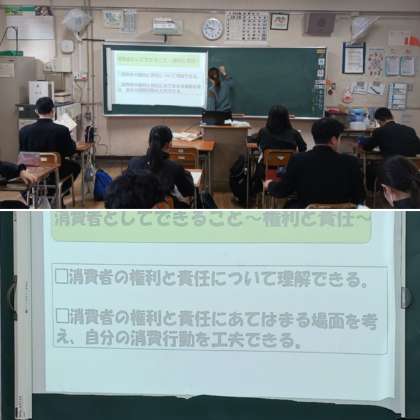 3年生の家庭科の授業では「消費生活と環境」について学習しています。「責任ある消費者になるために」をテーマに、消費者としてできることについて子どもたちは考えています。先生から、権利や責任について国際消費者機構が挙げる「8つの権利と5つの責任」の話がありました。