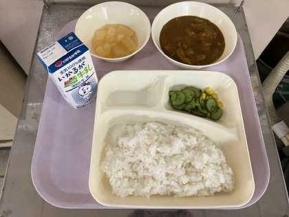 今日の給食は、チキンレバーカレーライス、牛乳、きゅうりとコーンのサラダ、洋なし(カット缶)、です。