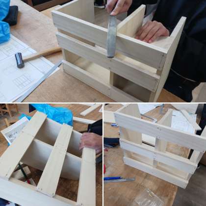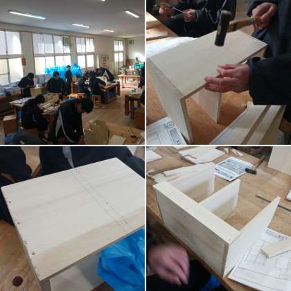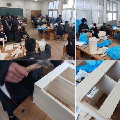 1年生の技術の授業の様子です。「材料と加工の技術」について学習しています。イージーラック作成の4回目の実習です。今日は接合作業を行っています。来週は修正作業を行います。いよいよ完成間近です。