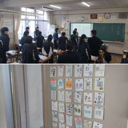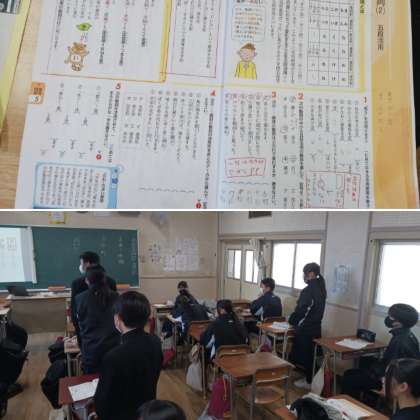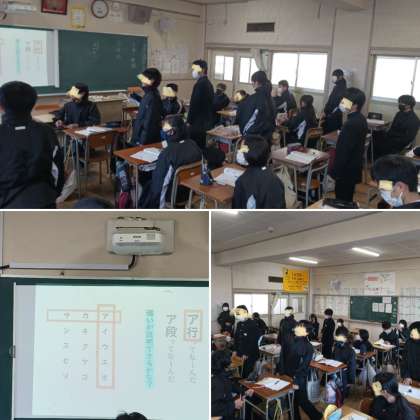 1年生の国語の授業は「動詞の五段活用」について学習しています。動詞の未然形、連用形、終止形、連体形、仮定形、命令形等について、声に出しながら先生や友達同士で答えながら理解に繋げています。