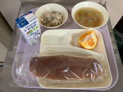 今日の給食は、黒糖パン、牛乳、押麦のグラタン、スープ、デコポン、です。