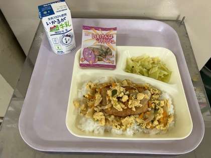 今日の給食は、かつ丼(カツ)、かつ丼(具)、牛乳、キャベツの梅風味、いもけんぴフィッシュ、です。