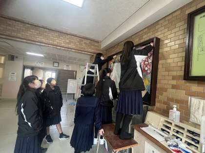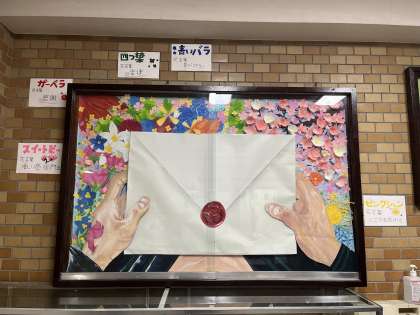 この絵は、美術部が卒業する先輩へ感謝の気持ちを込めて制作しました。描いた花には一つ一つ意味があります。玄関に展示していますので、ぜひ見てください。卒業式が近づいた頃には、なんと封筒を開けてメッセージが出てくる仕組みになっています。楽しみにしていてくださいね♪