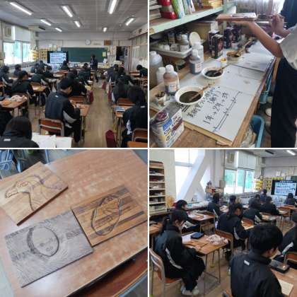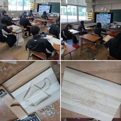 1年生の美術の授業は「木彫レリーフ」を作っています。「命あるもの」をテーマに作品制作を行っています。彫刻刀の作業もとても細かく本物に近づくように工夫して行っています。