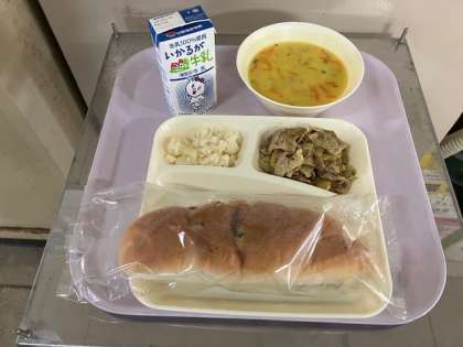 今日の給食は、レーズンパン、牛乳、豚肉のカレー風味焼き、コーンスープ、カリフラワーのピクルス、です。